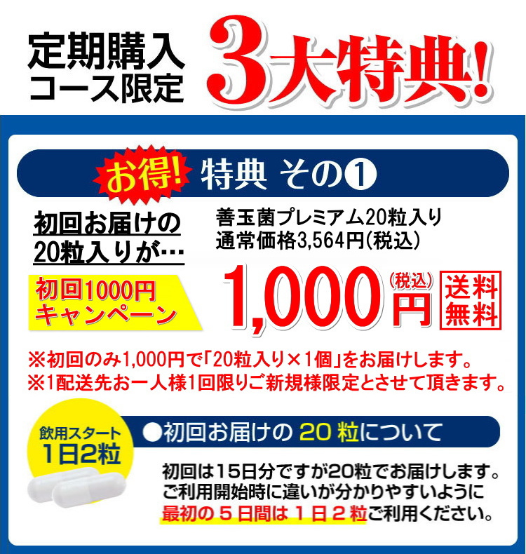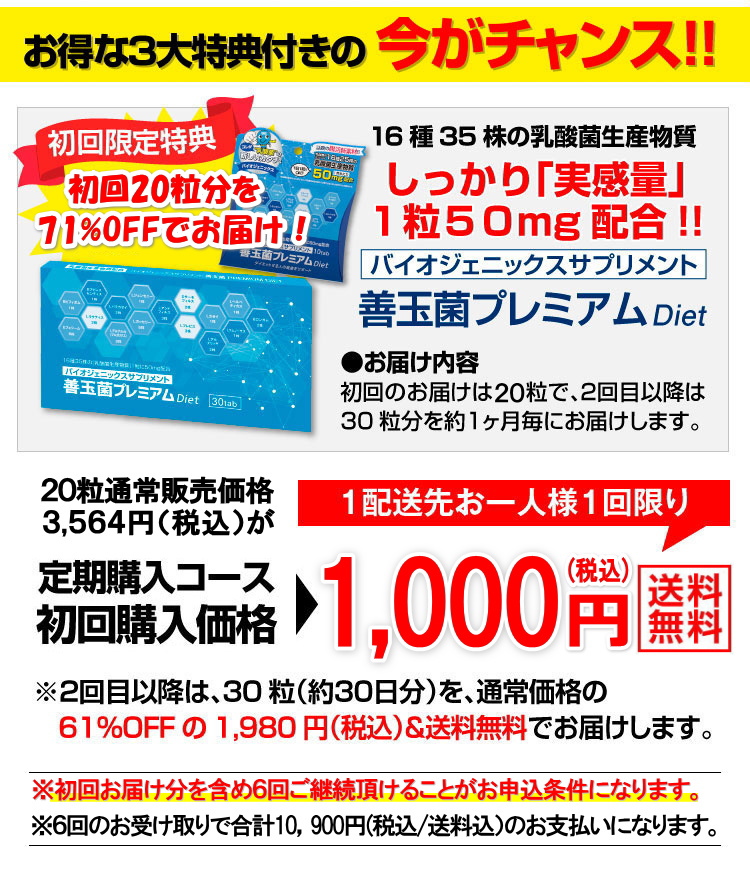 ●初回は20粒入り×1個を初回限定特価1,000円でお届けします。2回目以降は毎月30粒入り×1個を1,980円でお届けします。 |