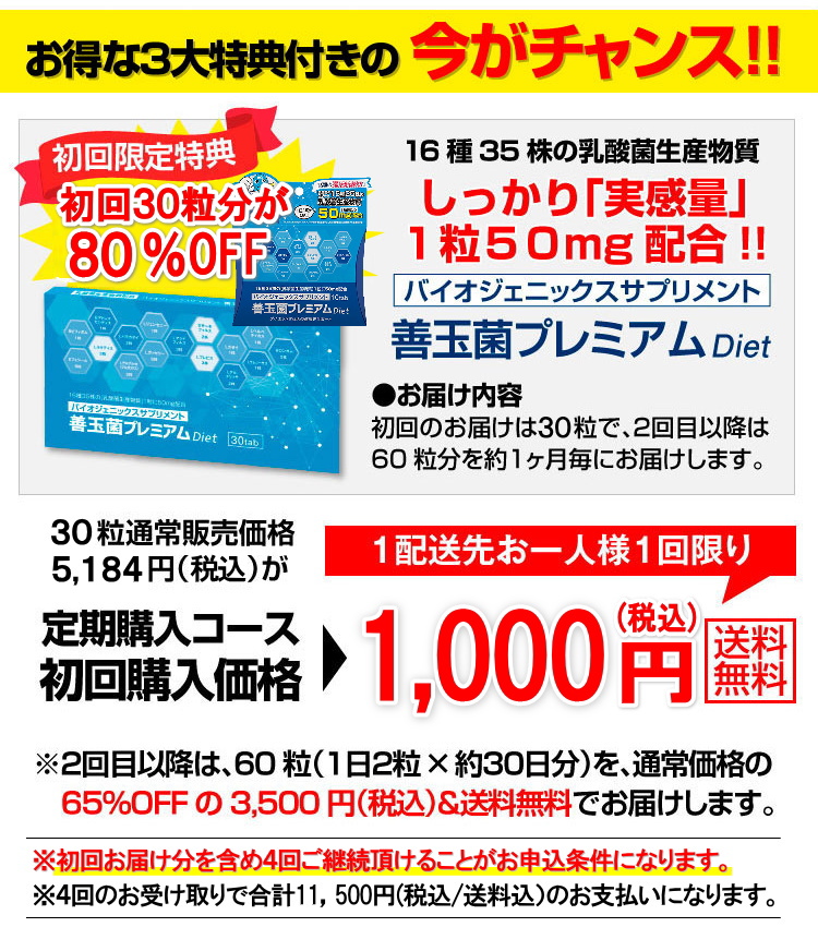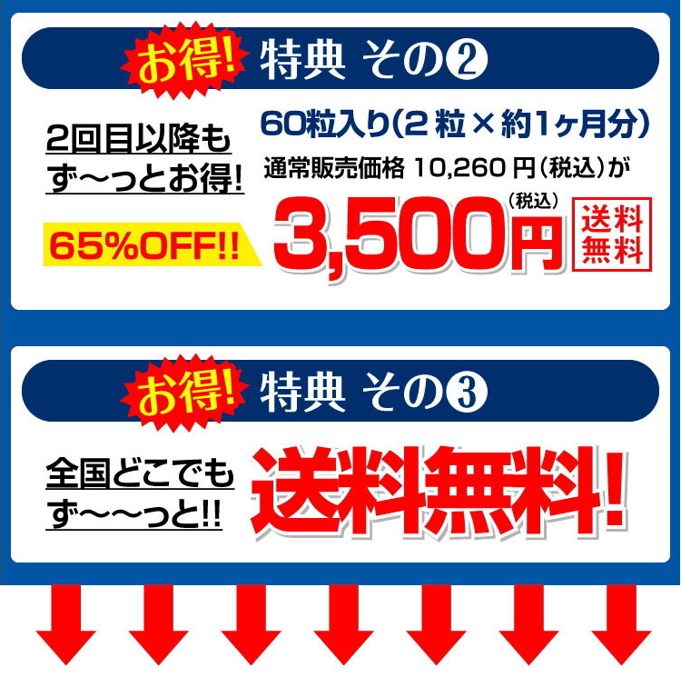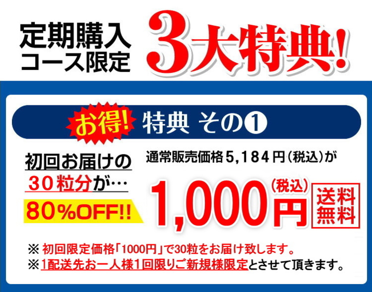 ●初回は半月分30粒入り×1個を初回限定特価1,000円でお届けします。2回目以降は毎月60粒入り×1個を3,500円でお届けします。 |